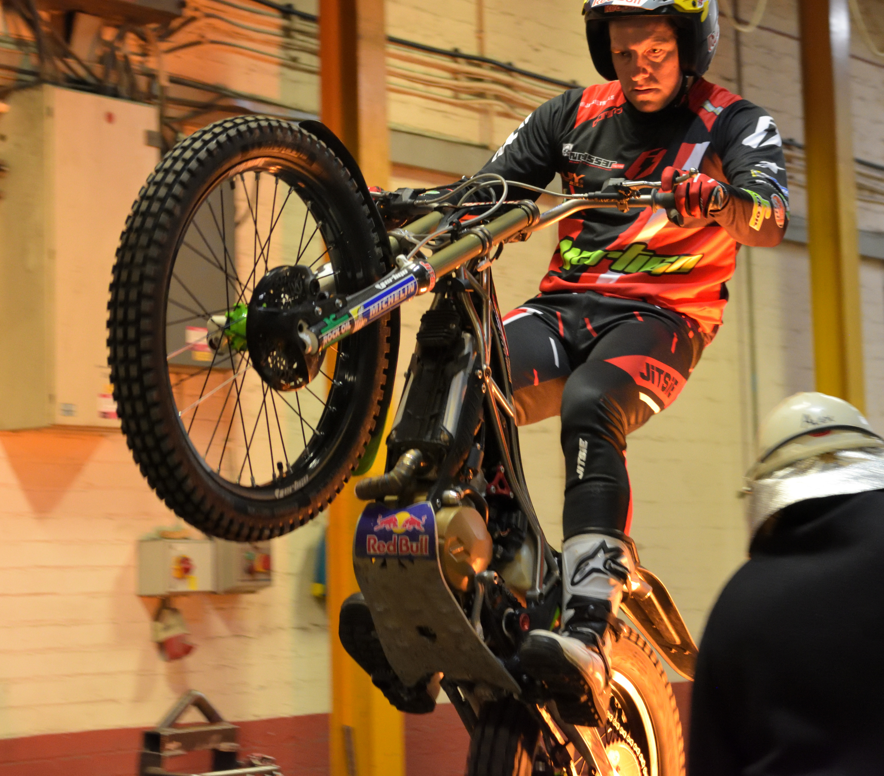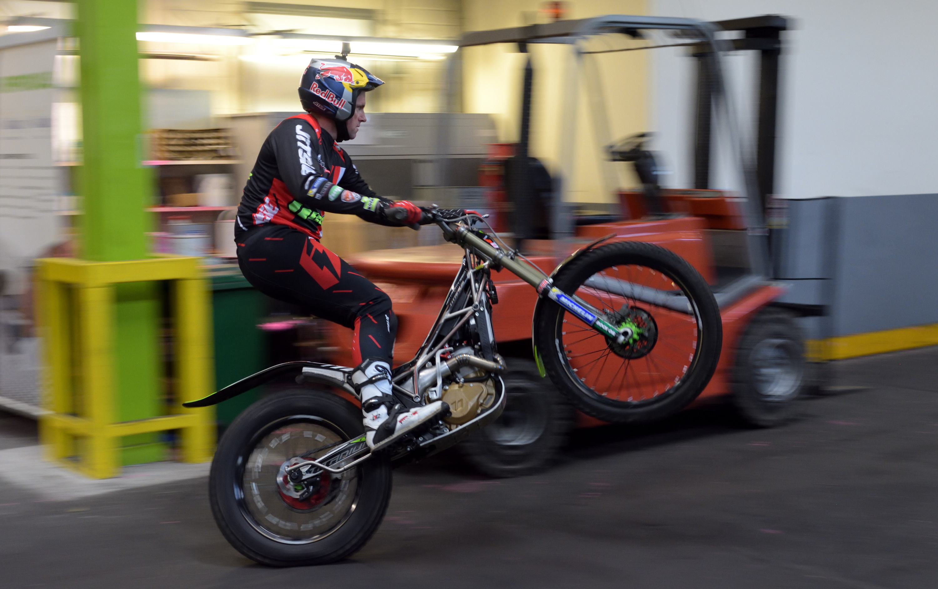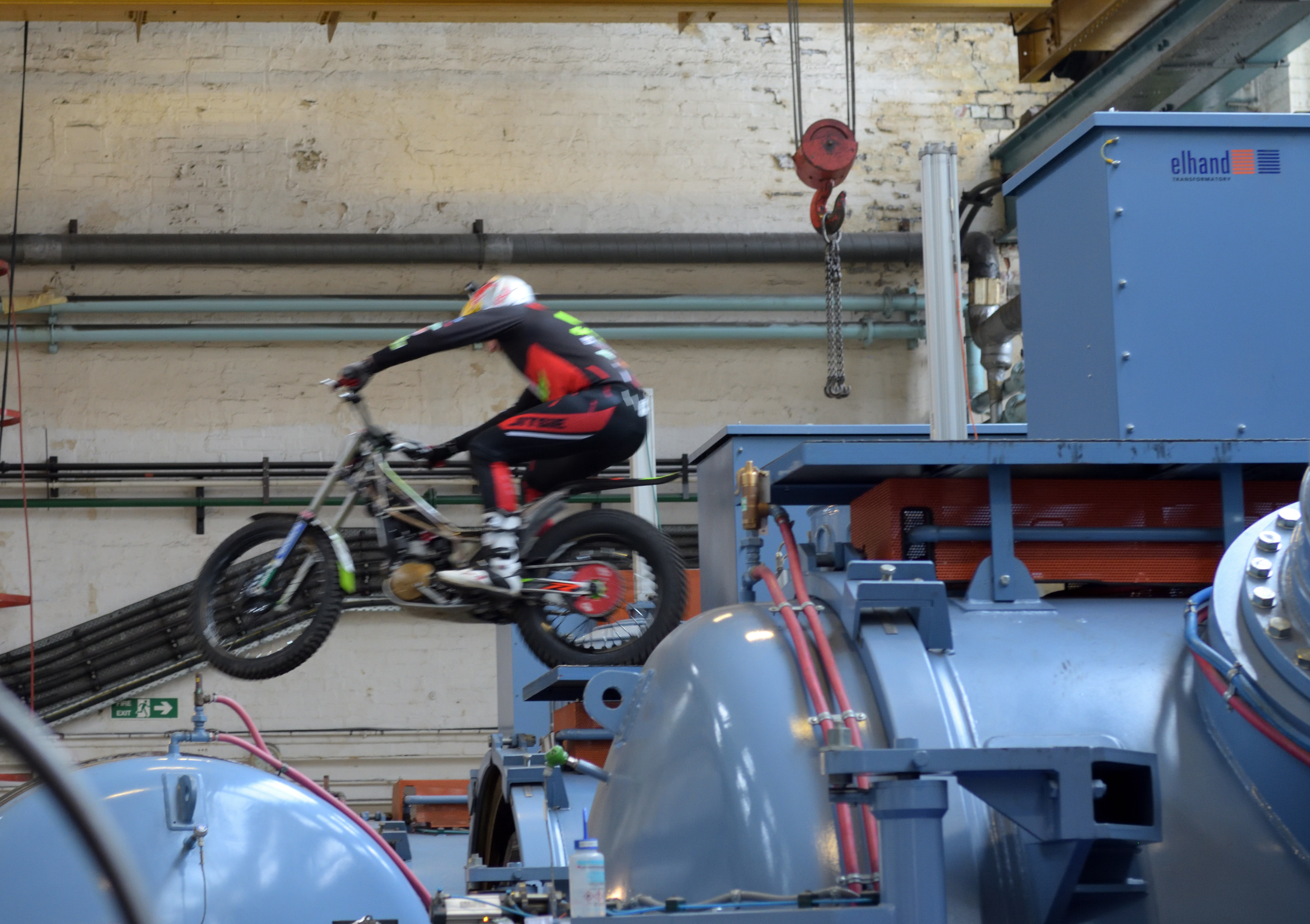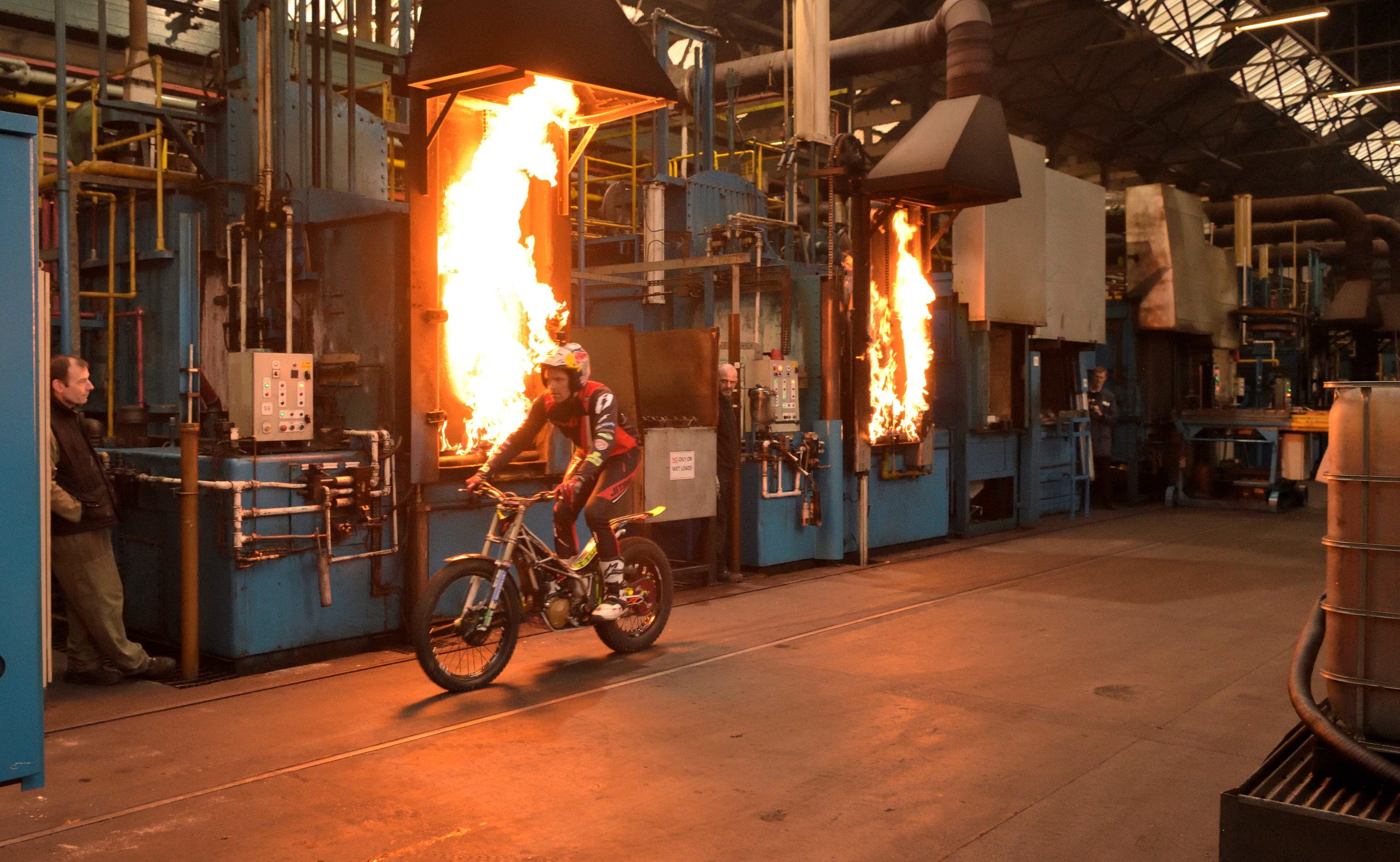1a) 12 times Trials World Champion, Dougie Lampkin, rides past flaming furnaces at Wallwork Heat Treatment